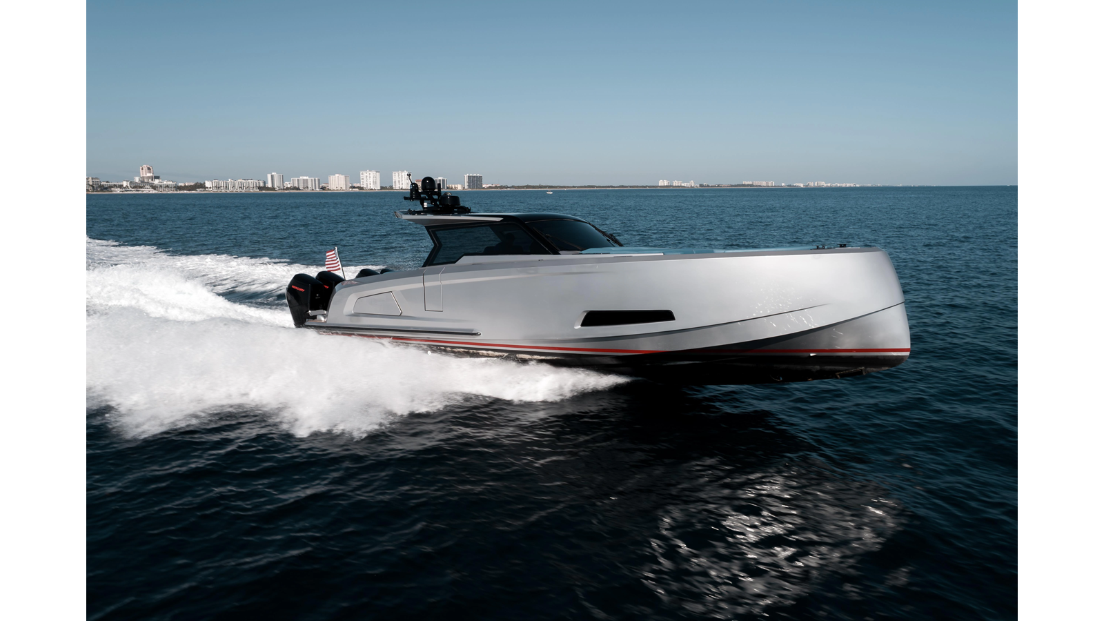 The quad Mercury V10 600HP outboards provide excessive performance, hole shot, and a top speed of over 60 knots. The joystick (with skyhook) and bow thruster make maneuvering in tight spaces effortless, while the SeaKeeper 6 and ZipWake automatic interceptor tabs add stability both at speed and rest.